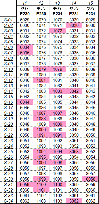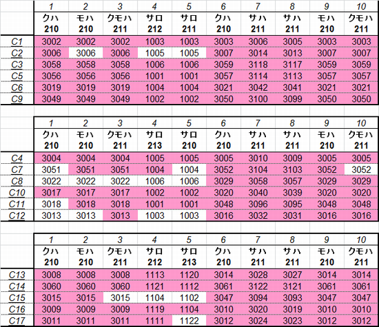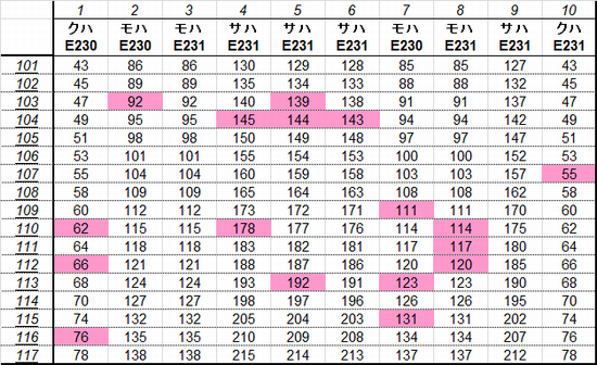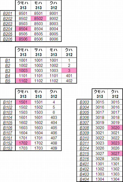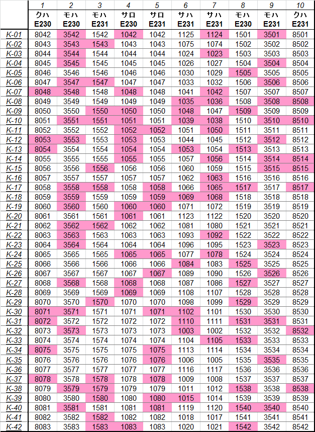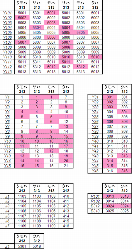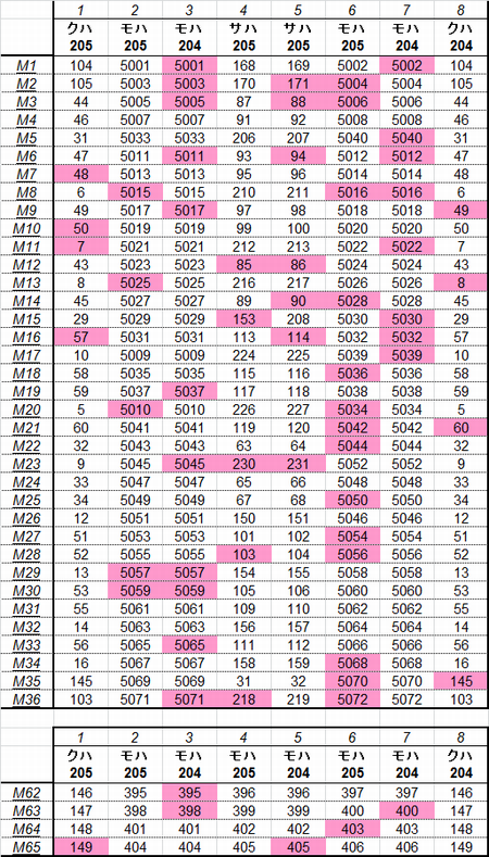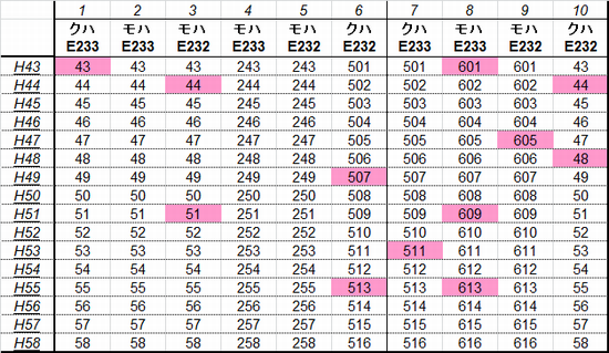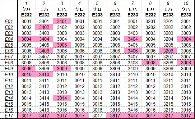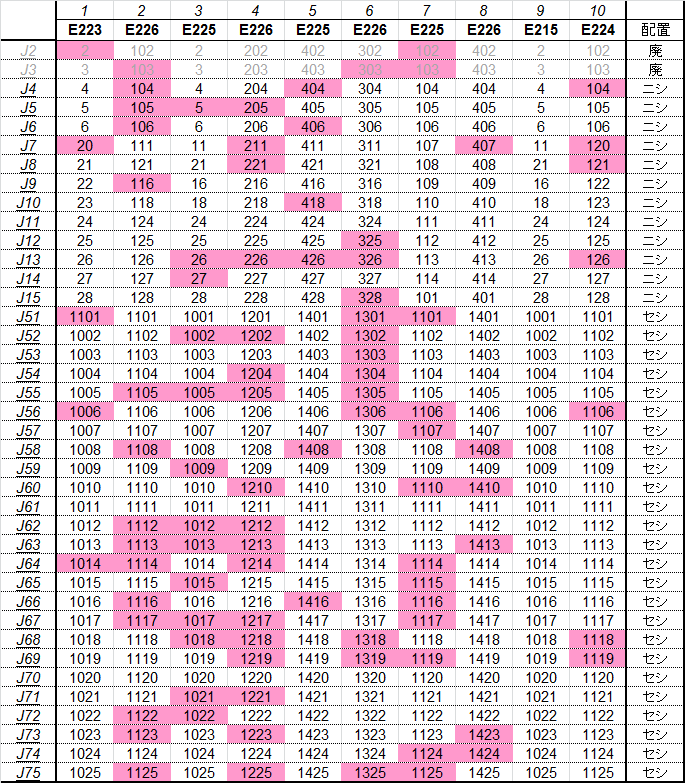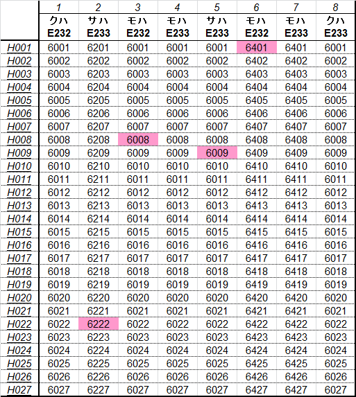 乗車した列車の車番は1999年から記録を付けていますが、公開するのに適した方法を上手く見つけられないため、主要編成に限り編成単位で紹介することにしました。まとまりしだい、ボチボチ増やしていく予定です。クリックすると、某表計算ソフトのスクリーンショットが出てきます。ピンクの色つきセルが、既乗車両です。→順次、表示方式をPDFに改めています。
